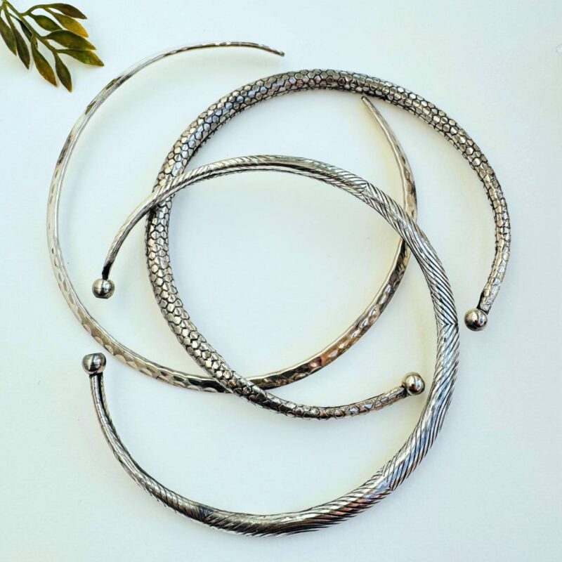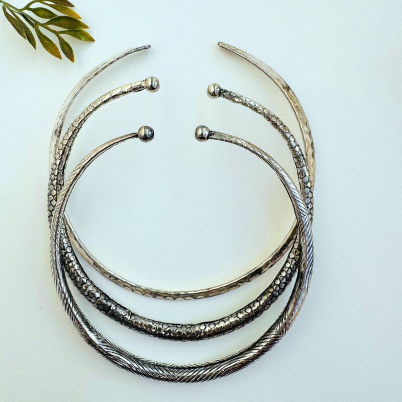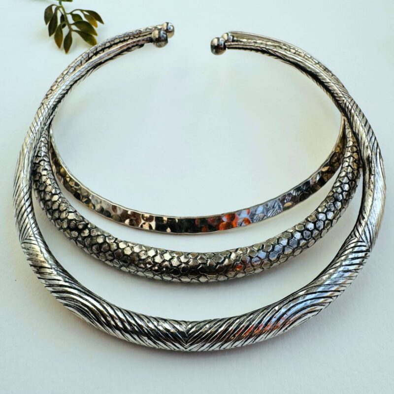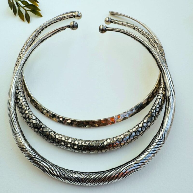 Boho Etched Silver Toned Brass Choker Set – Mixed Designs, Set of 3