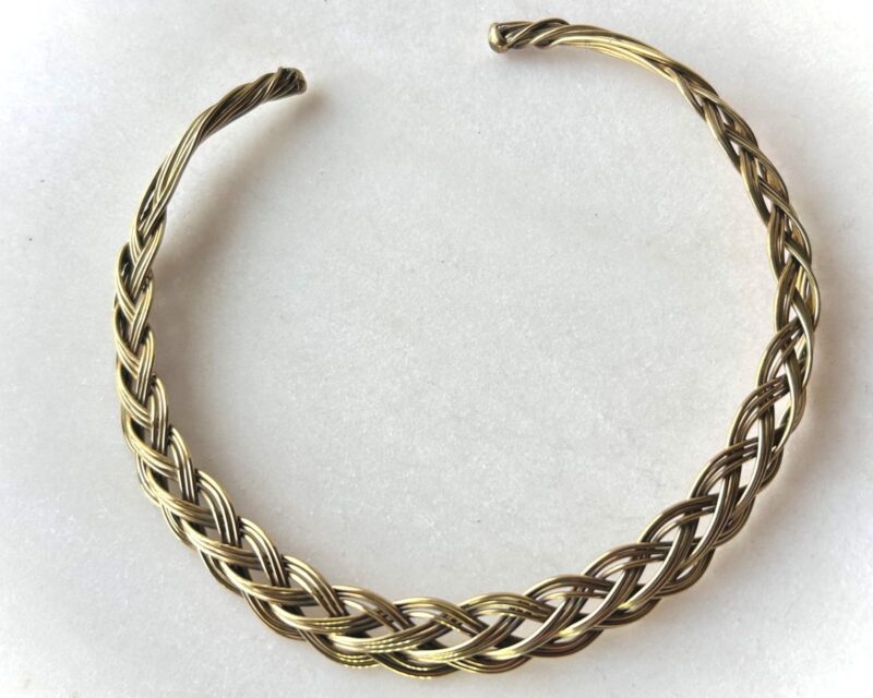 A sculptural brass choker formed from intricately braided wires, creating a rich woven texture with depth, movement, and timeless character. Designed to make a strong statement while remaining comfortable and wearable.