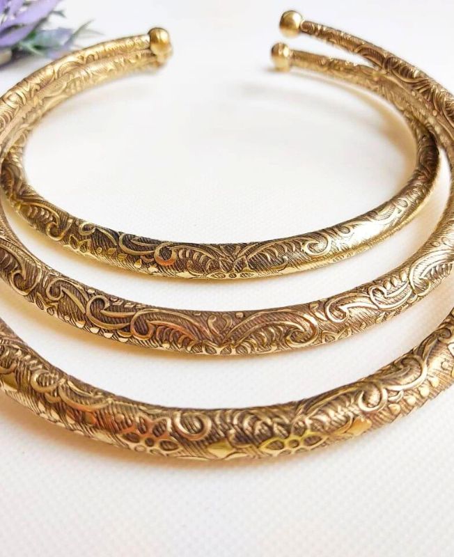 This elegant set features three individually handcrafted brass chokers, each showcasing intricate, ornate engravings inspired by vintage and ethnic motifs. Designed with a gently curved silhouette and finished with polished ball-tip ends, these pieces combine comfort with bold, artistic expression. Whether layered together for a dramatic look or styled separately for a more minimal statement, this versatile set elevates any outfit. The high-quality solid brass construction ensures durability while maintaining a timeless, antique finish that complements both modern and traditional wardrobes.