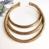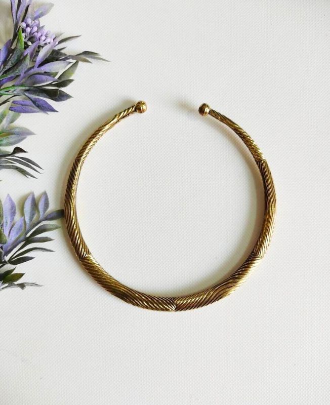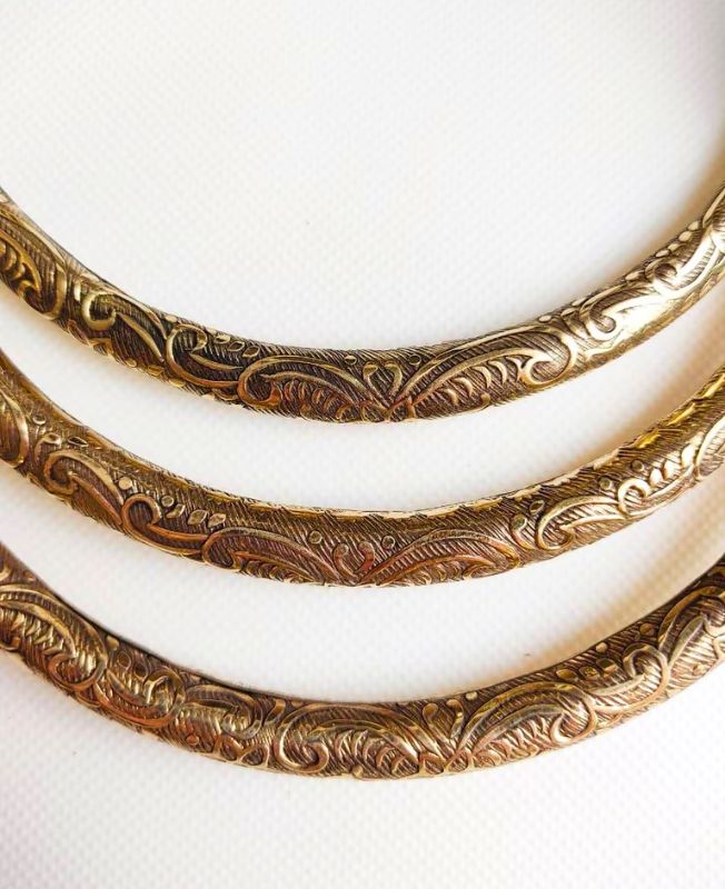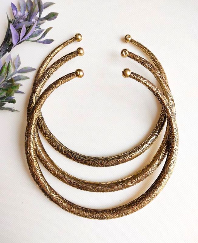 This elegant choker set features three handcrafted brass pieces with detailed ornate engravings. Their rounded shape and smooth ball ends create a classic silhouette with a bold, tribal-inspired feel. Ideal for statement looks or boho styling, they can be worn layered or on their own.