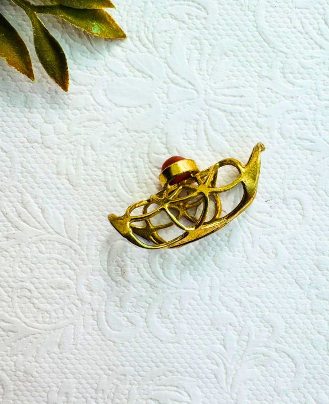 Add a pop of warm color and bold design to your hairstyle with this stunning brass dreadlock bead. The cuff boasts an elegant, detailed pattern of open scrolls and curves, reminiscent of classic vine or Celtic knot work. This ornate framework beautifully cradles a smooth, polished round stone likely a Carnelian or similar gemstone in a vibrant red or deep orange hue, creating a captivating focal point.