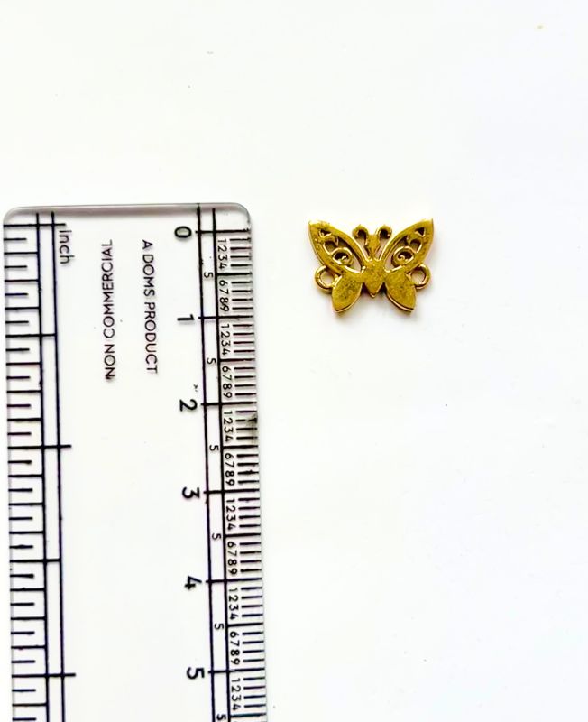 This charming gold butterfly connector features graceful cutout details and a symmetrical wing design. With loops on both sides, it is ideal for stringing into bracelets or as a centerpiece in layered designs.