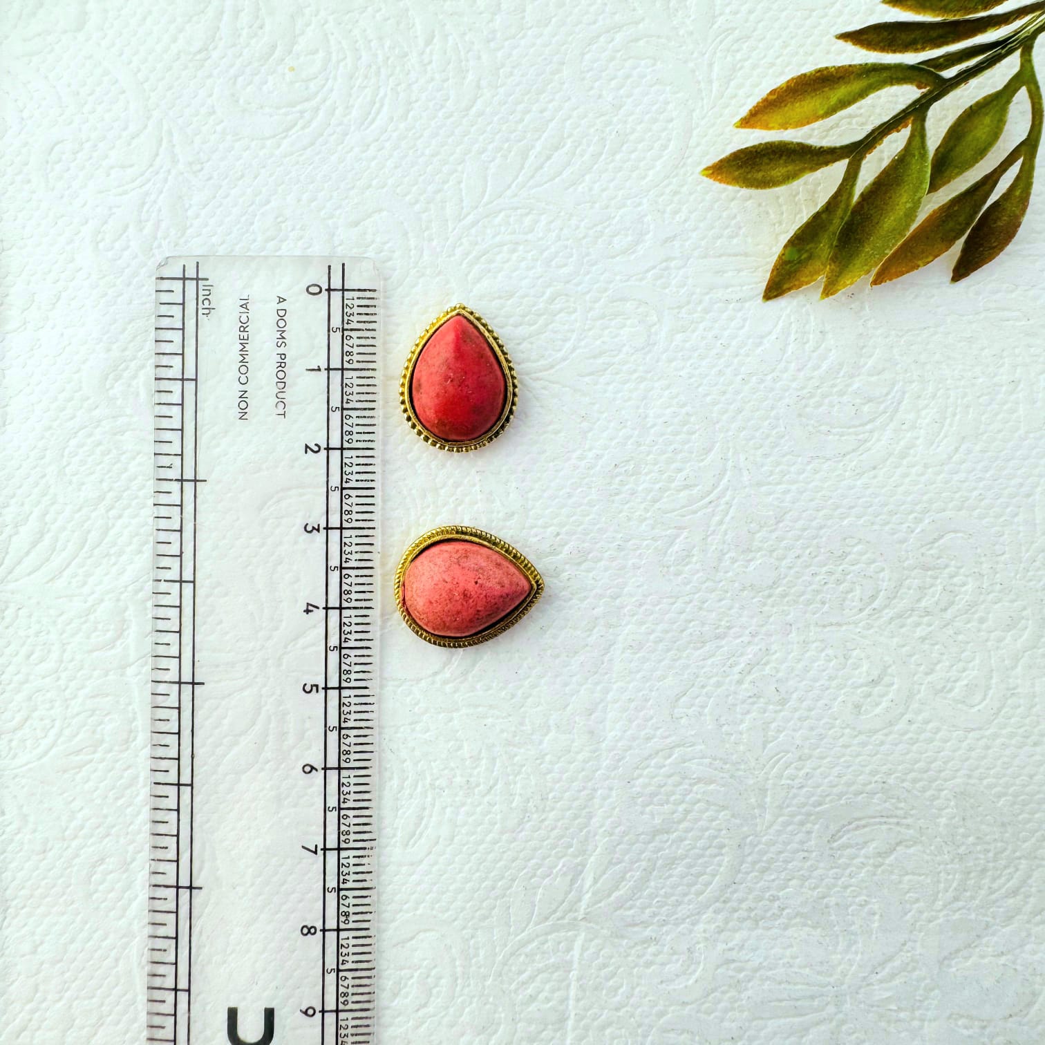 Elegant teardrop shaped brass grooves with polished Coral Red stones, framed in a detailed metallic border