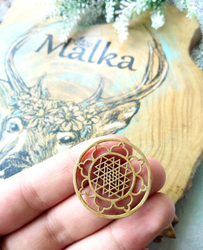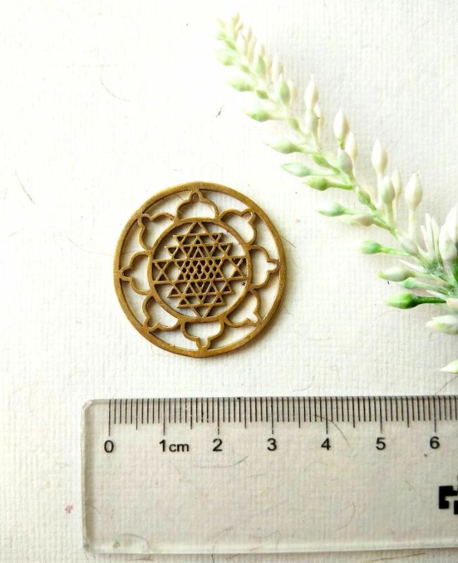 An intricately cut brass pendant featuring the sacred Sri Yantra within a lotus mandala frame. Perfect for spiritual jewelry, malas, or symbolic macrame creations.
