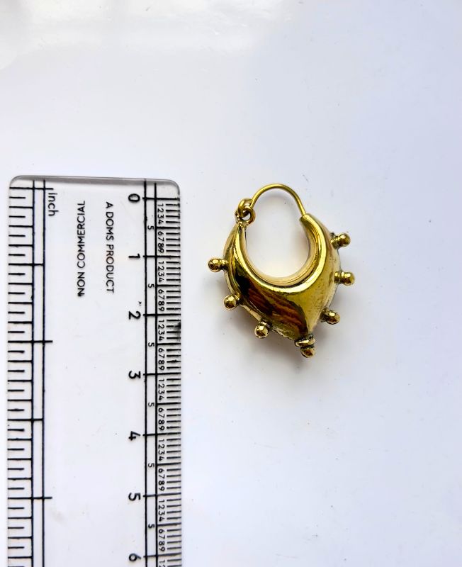 Bold crescent-shaped brass earrings in antique gold tone with intricate dotted patterns, perfect for boho or ethnic-inspired looks.