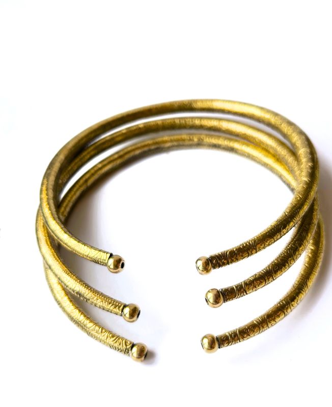 Crafted from high-quality brass, this triple-band choker features intricate embossed detailing that captures light beautifully. Each band is slightly curved for a comfortable fit, and the open-back design makes it easy to adjust for your perfect size. The rich golden hue of the brass adds warmth and sophistication, making it a versatile accessory for any wardrobe.
