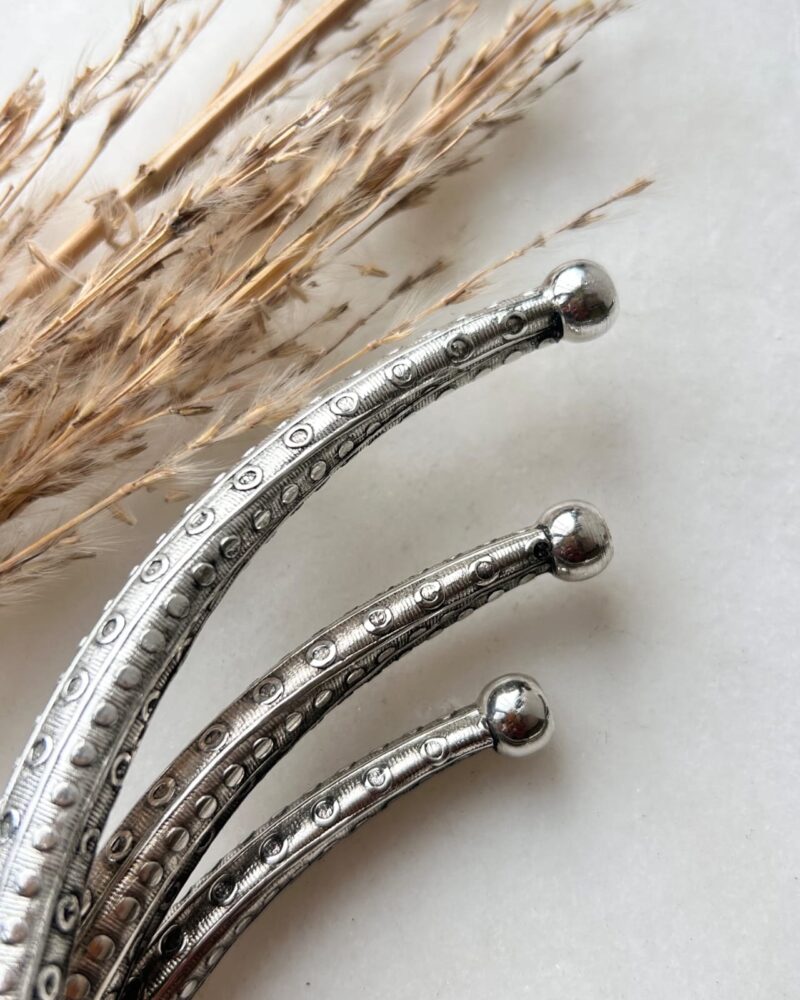 A handcrafted silver tone brass choker featuring detailed engraved and dotted patterns with smooth ball ends. A timeless design inspired by traditional metalwork with a bold yet refined presence