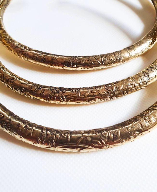 This striking set of two brass chokers is crafted with intricate botanical engravings that wrap around their round structure, creating a natural yet regal texture. The floral vine pattern gives these collars an earthy charm while maintaining a bold presence. Each piece is handmade and slightly adjustable, designed to comfortably rest around the neck as a standalone accessory or foundation for tribal-inspired creations.