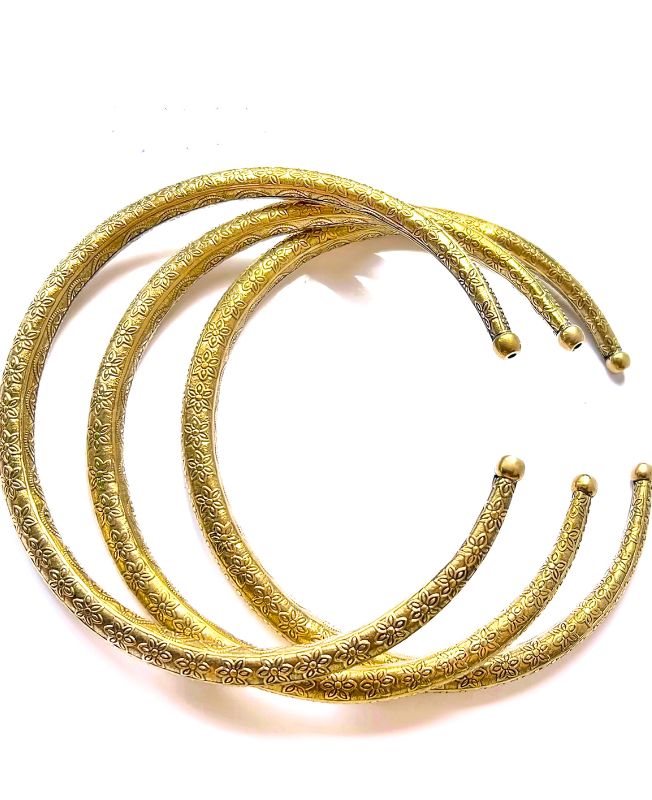 This floral-embossed brass choker features three gracefully arched bands, each meticulously decorated with repeating flower motifs. The open-back design ensures a comfortable fit, while the warm golden tone of the brass brings a classic touch to any ensemble. Its handcrafted details make it an ideal accessory for those who appreciate artisanal jewelry with a story.