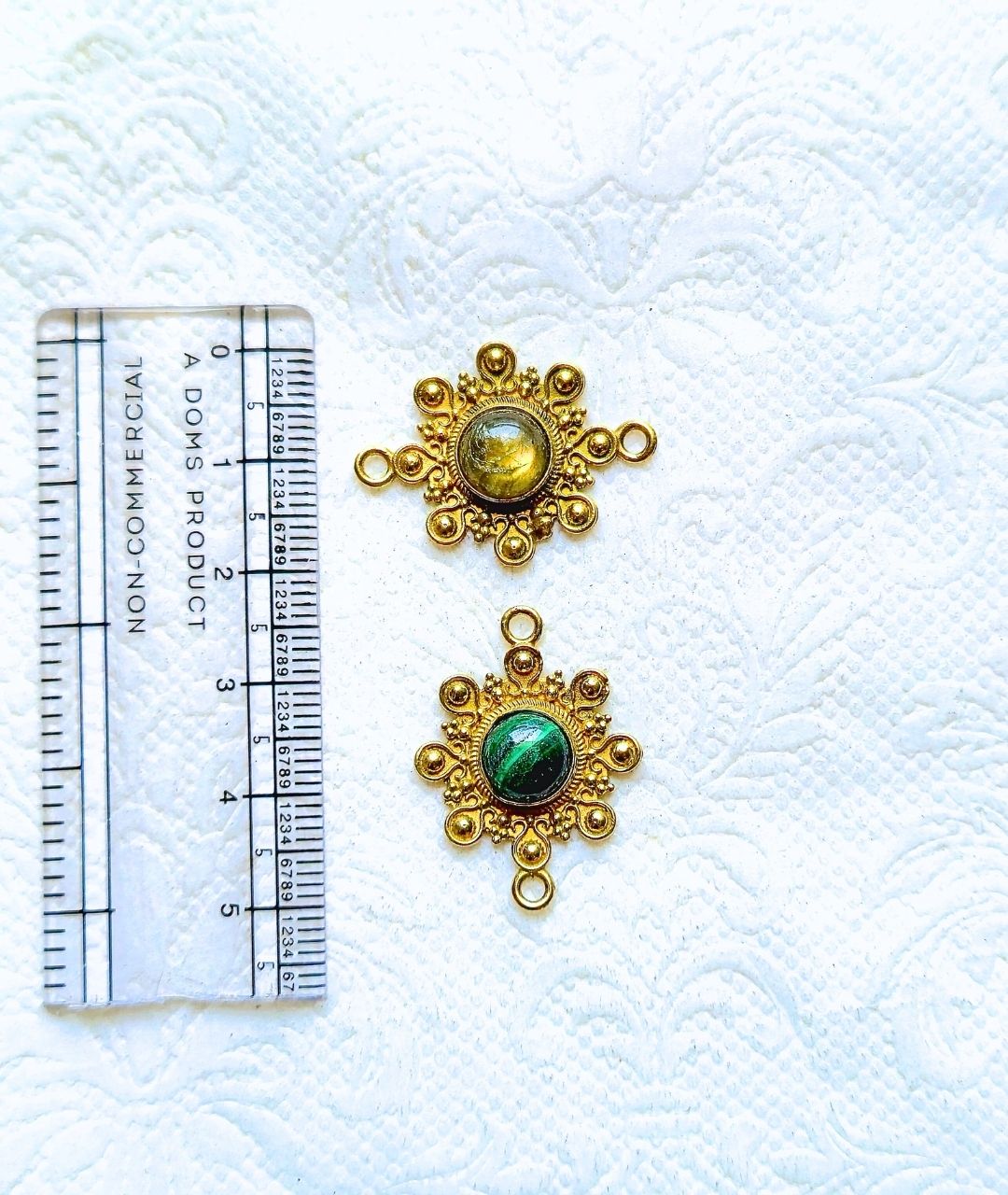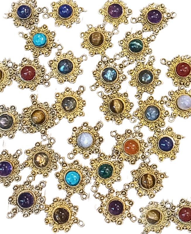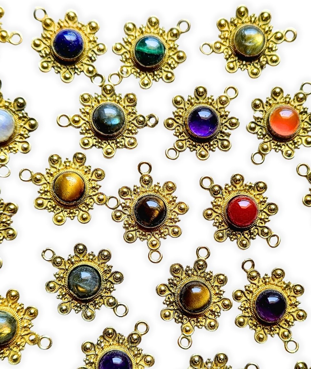 Add a touch of elegance and earthy charm to your creations with our Mandala gemstone brass charms. These premium connectors are made with an antique gold-tone brass alloy base and feature a polished gemstone cabochon at the center. Each piece is meticulously crafted, making it perfect for jewelry making, macrame art, and other creative projects.