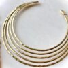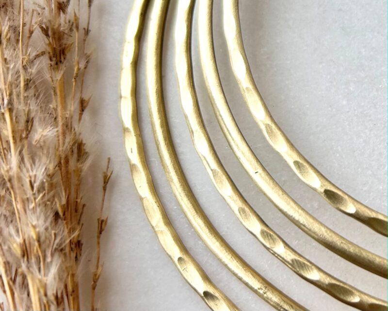 Five softly curved brass bands flow together in a layered formation, each one hand-hammered to create delicate oval impressions along the surface. The result is a refined texture that reflects light beautifully while maintaining an organic, handcrafted feel.