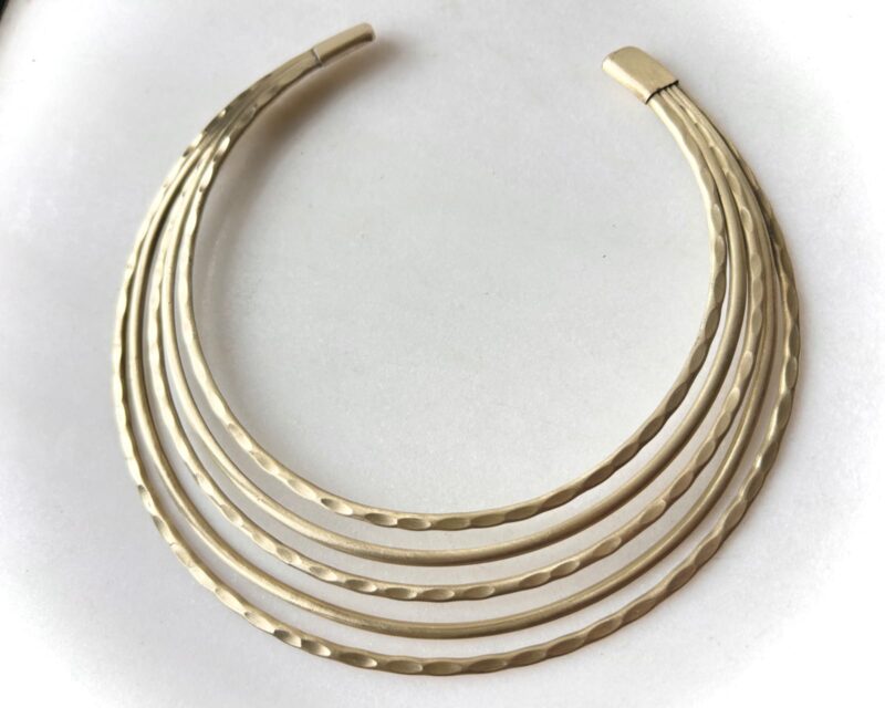 A sculptural layered brass choker featuring gently hammered textures that catch the light with every movement. Designed to make a strong statement while remaining comfortable and wearable.