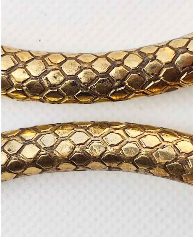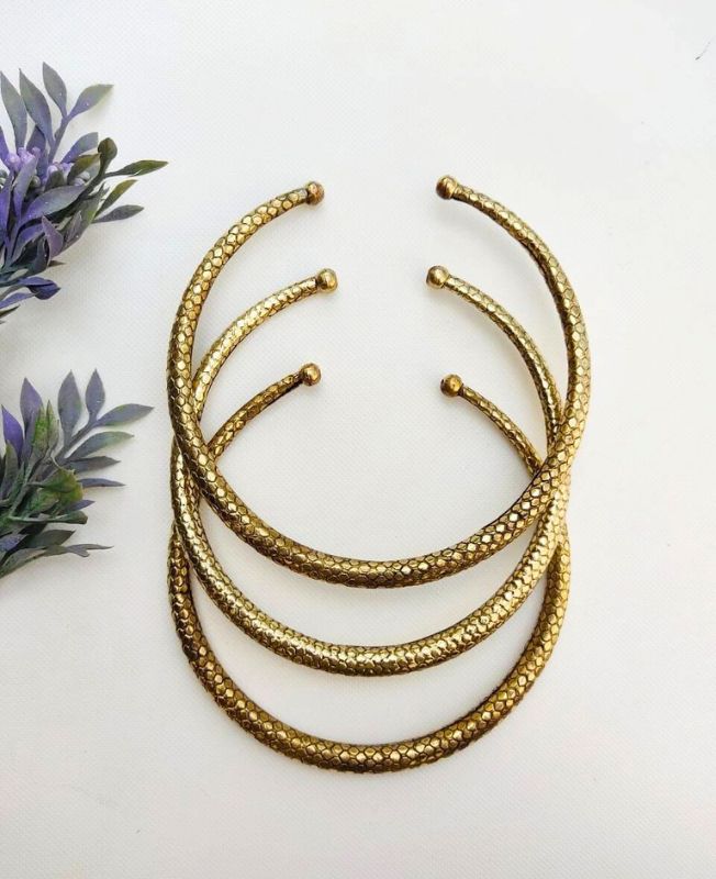 This eye-catching brass choker set features three individually handcrafted pieces, each embossed with a bold hexagon-pattern texture resembling honeycomb. The faceted surface reflects light from every angle, adding a strong geometric character to the smooth, rounded silhouette. Finished with rounded ball ends, these chokers offer a comfortable and secure fit.