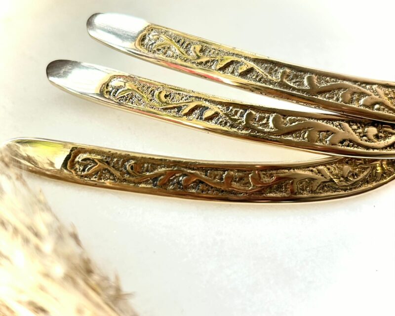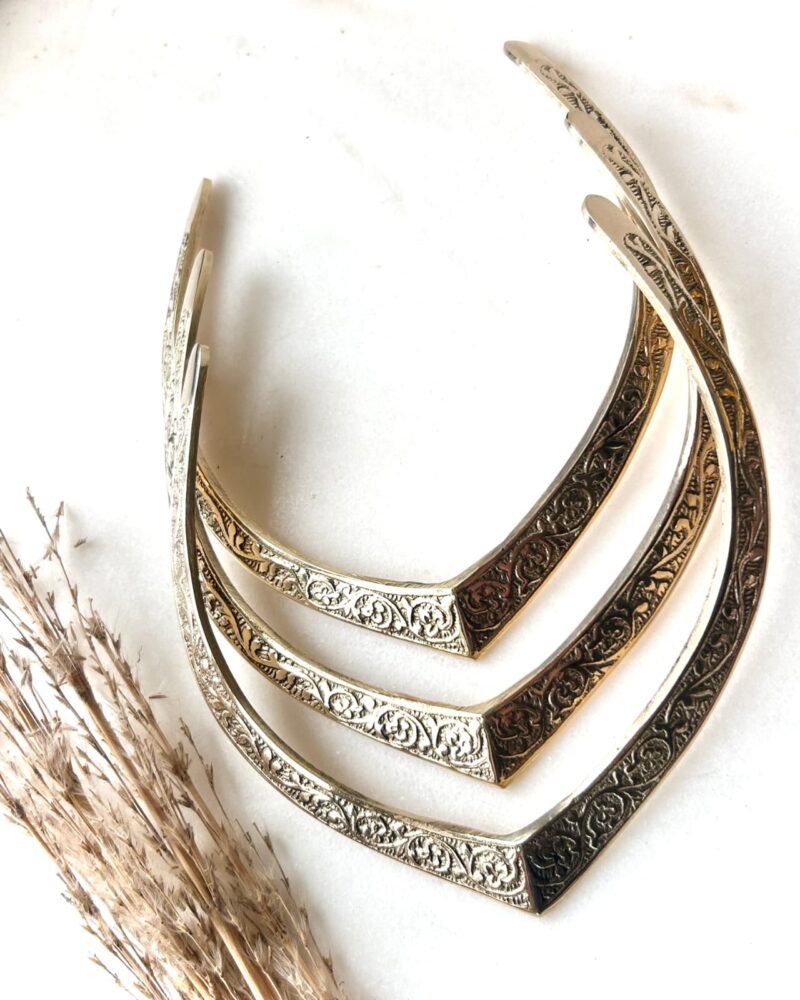 This layered brass choker is defined by its striking V-shape form and detailed engraved floral relief pattern, creating depth, texture, and a strong visual presence. Each band is carefully shaped and engraved, resulting in a harmonious layered