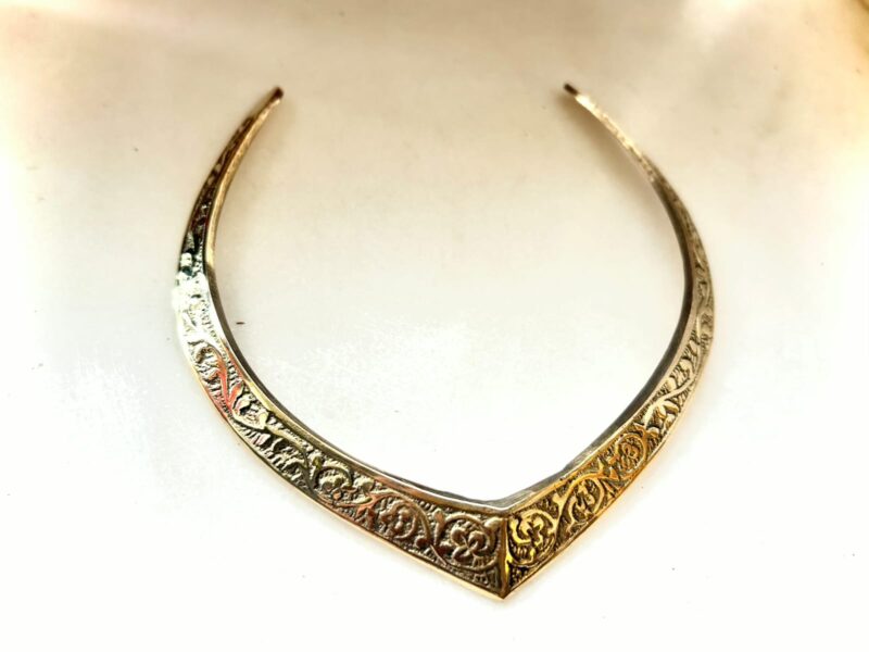 A bold yet elegant layered brass choker featuring a sharp V shape silhouette and intricate engraved floral motifs. Designed to make a strong statement while remaining comfortable and wearable.