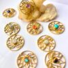 These Lotus Flower Brass Discs capture the essence of tranquility and beauty through their openwork floral design and gemstone centerpiece. The detailed lotus motif is delicately cut into a round brass disc, offering a lightweight yet sturdy base for pendants, statement earrings, or symbolic bracelets. Each piece is finished with a polished cabochon gemstone, adding a touch of natural elegance and energy to the design.