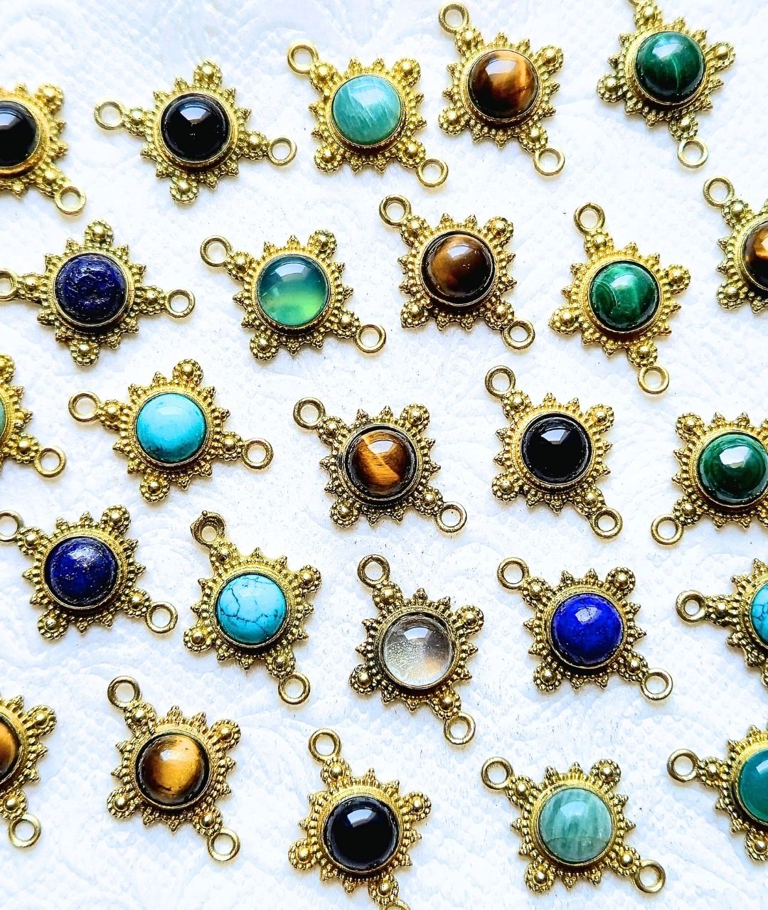 Add a touch of elegance and earthy charm to your creations with our Mandala gemstone brass charms. These premium connectors are made with an antique gold-tone brass alloy base and feature a polished gemstone cabochon at the center. Each piece is meticulously crafted, making it perfect for jewelry making, macrame art, and other creative projects.