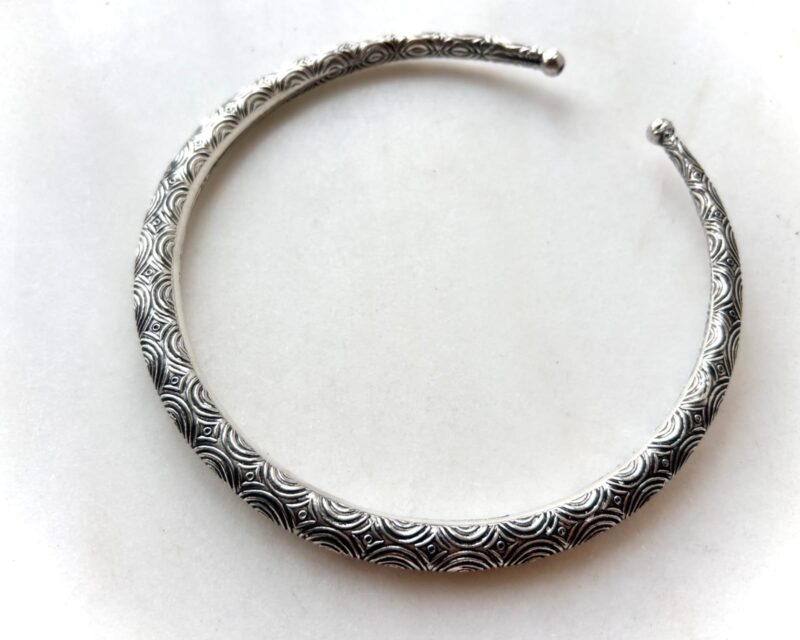 This layered silver-tone brass choker is defined by its elegant arc shape and detailed engraved surface. The repeating geometric wave motif creates depth and movement, catching the light from every angle and highlighting the handcrafted character of the piece. The open-back design allows for easy wear while maintaining a strong, structured look around the neck. The layered construction adds dimension without feeling heavy, making it suitable both as a statement piece on its own or as part of a curated, bohemian-inspired jewelry style.