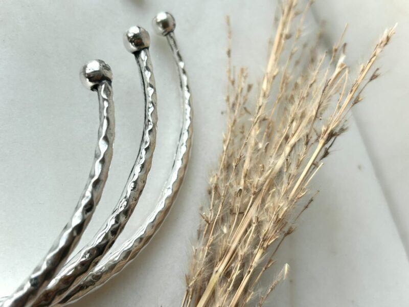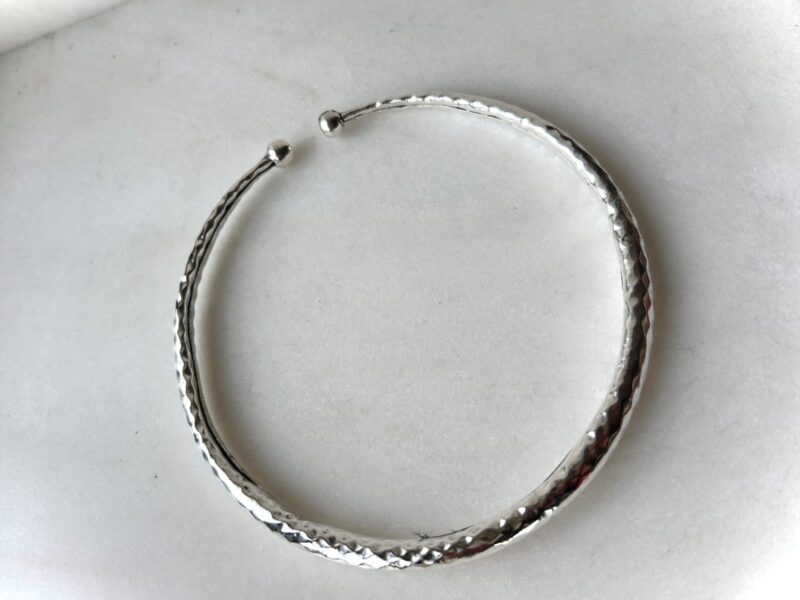 The Moonlight Facet Hammered Brass Choker is defined by its beautifully hand-hammered surface, creating a subtle faceted texture that reflects light from every angle. The organic rhythm of the hammer marks gives this piece depth and movement, while maintaining a clean, minimalist silhouette. Crafted from silver tone brass, this open choker is slightly flexible for a comfortable fit and finished with smooth rounded ball ends for effortless wear. The design works perfectly as a standalone statement or layered with other chokers for a bold, contemporary look.