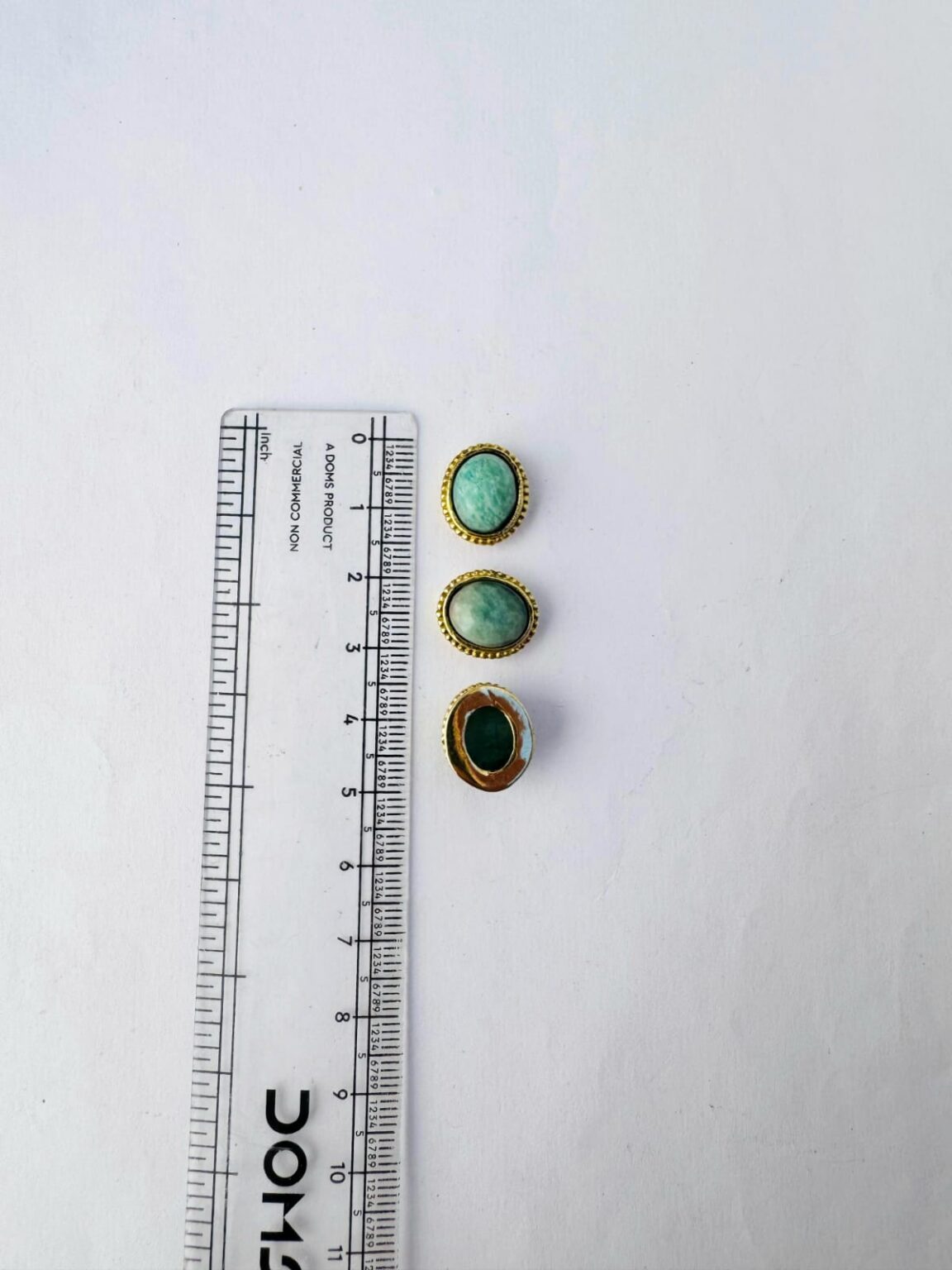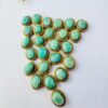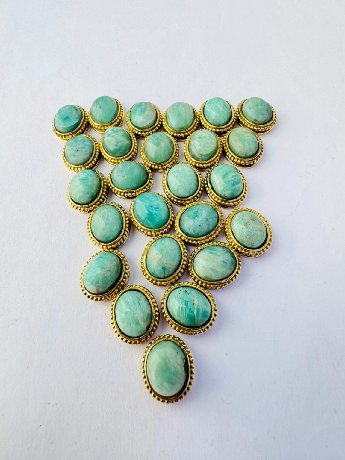 This brass cabochon settings showcases oval stones in shades of Amazonite, each securely encased in a detailed brass bezel. The brass frame features a subtle rope like groove around each edge, adding both texture and richness to the design.