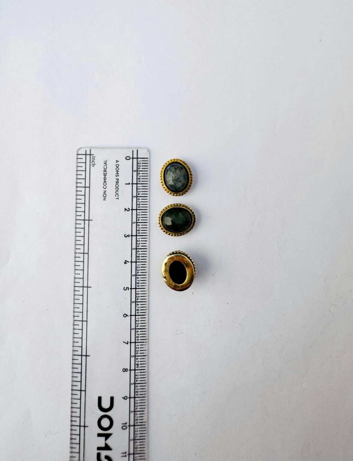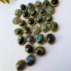 This brass cabochon settings showcases oval stones in shades of Labradorite, each securely encased in a detailed brass bezel. The brass frame features a subtle rope like groove around each edge, adding both texture and richness to the design.