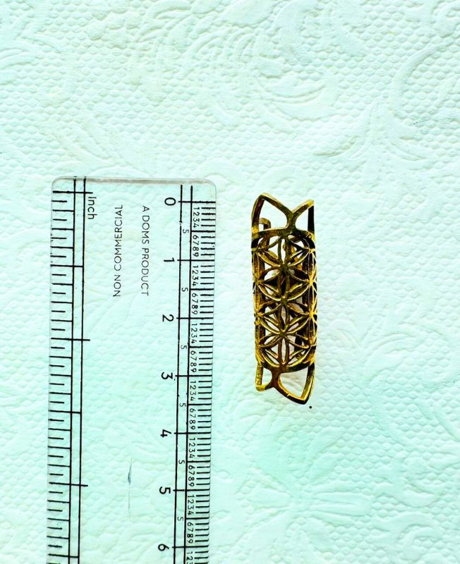 Adorn your hair with the ancient, powerful symbol of the Flower of Life, intricately cut into this stunning brass dreadlock cuff. This sacred geometric pattern, composed of multiple overlapping circles, symbolizes the blueprint of the universe and deepens the spiritual meaning of your style. The openwork design allows the light to catch the brass, highlighting the pattern beautifully.
