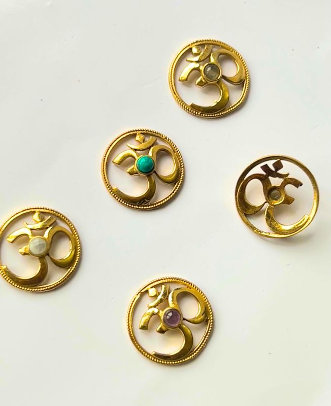 These Sacred Om Brass Discs combine spiritual symbolism with artistic craftsmanship. Each pendant features the ancient Om symbol, carefully shaped in solid brass and adorned with a smooth round gemstone at the center. The detailed border adds a refined finish, making these pieces ideal for elevating mala necklaces, statement pendants, or meaningful bracelets.