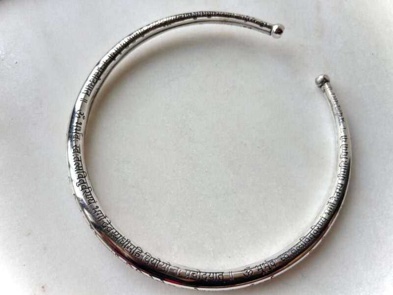 This silver-tone brass choker features a smooth, rounded silhouette adorned with finely engraved sacred script inspired by ancient Sanskrit mantras. The continuous text wraps gracefully around the neck, creating a powerful yet understated statement piece that carries both visual rhythm and symbolic meaning. Designed as an open choker with softly rounded ball ends, it offers comfortable wear and gentle flexibility, adapting naturally to the neckline. The polished surface enhances the engraved lettering, allowing light to reflect subtly while keeping the overall look refined and timeless.