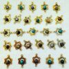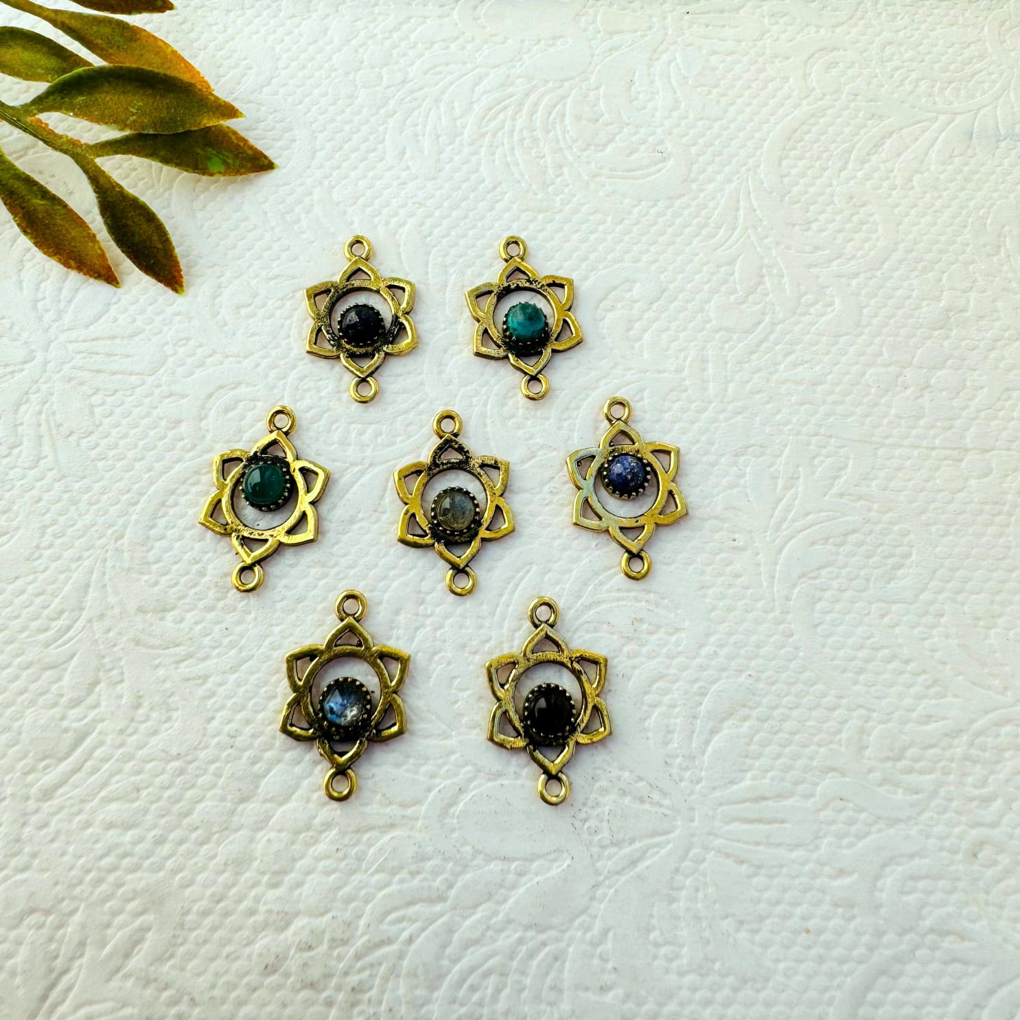 A collection of handcrafted brass charms featuring intricate lotus-style frames and natural gemstone cabochons in mixed colors. Each charm is made from solid brass with a vintage gold finish and unique stone variations.
