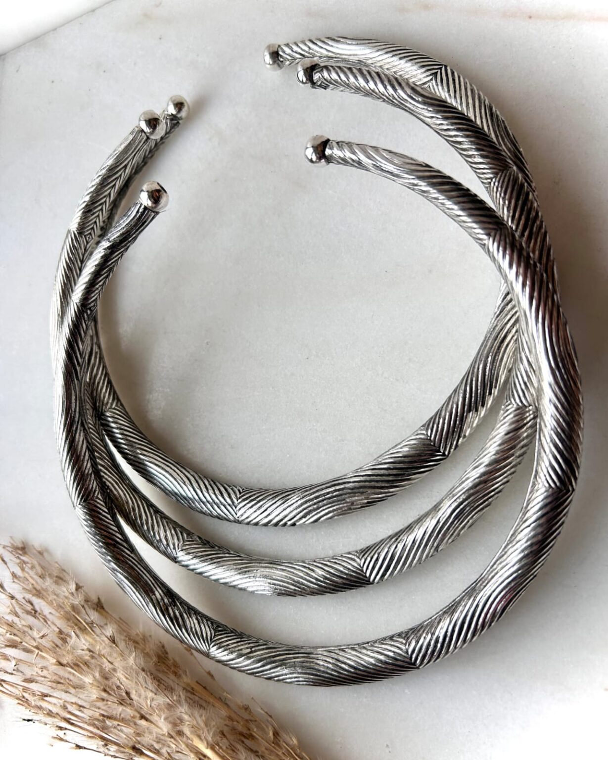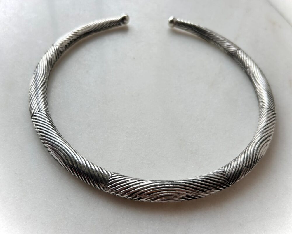 This silver tone brass choker is designed with a continuous twisted rope pattern, creating a dynamic surface that catches the light from every angle. The spiral cable texture adds depth and rhythm, giving the piece a powerful yet refined presence. Its open cuff design allows for easy wear and a comfortable fit, while the rounded ball ends provide a smooth, finished touch. Strong in form but elegant in feel, this choker bridges organic craftsmanship with contemporary minimalism.