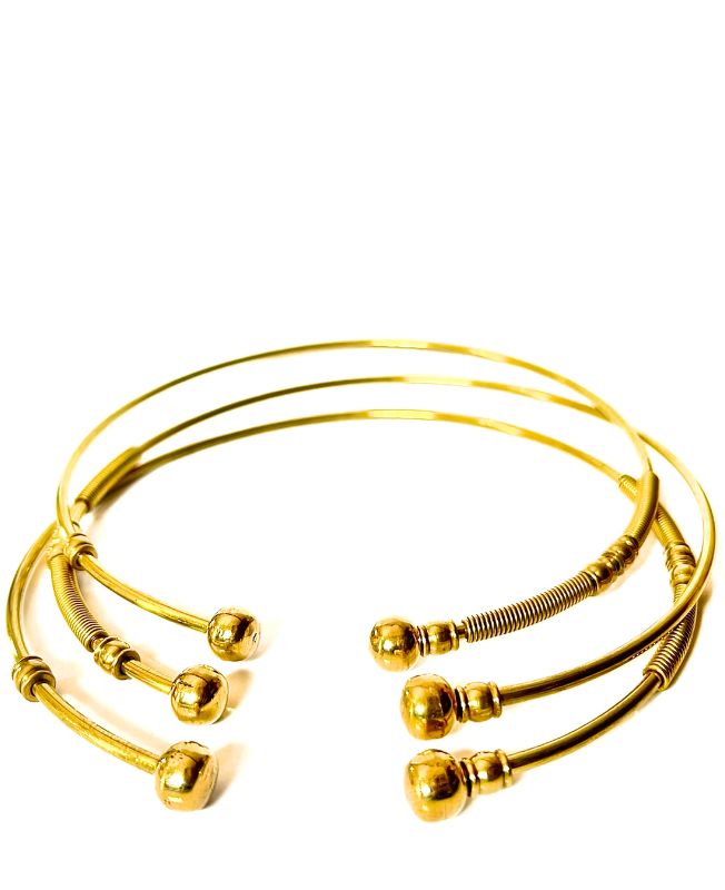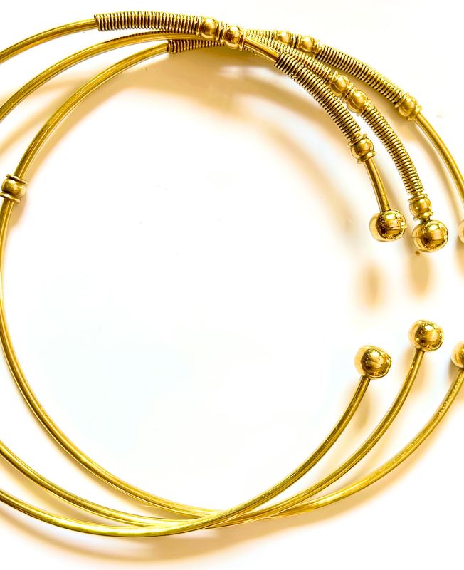 This minimalist brass torque choker set offers a refined and timeless design, featuring smooth bands accented with subtle coiled wire details. The open-ended style ensures an adjustable fit while maintaining a sleek and modern silhouette suitable for everyday wear or special occasions.
