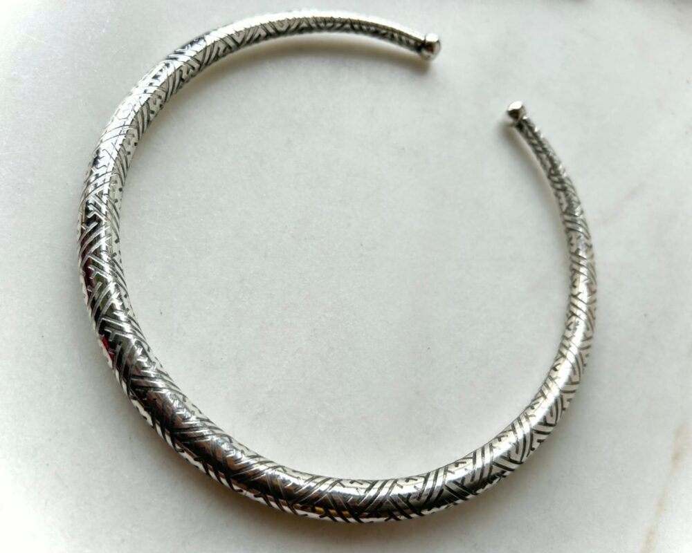 The Woven Path Silver Tone Brass Choker is defined by its continuous engraved chevron motif—an intricate, hand-finished pattern that creates depth, movement, and subtle reflection from every angle. The repeating geometric lines evoke woven paths and ancient symbols, giving the piece a strong yet timeless character.